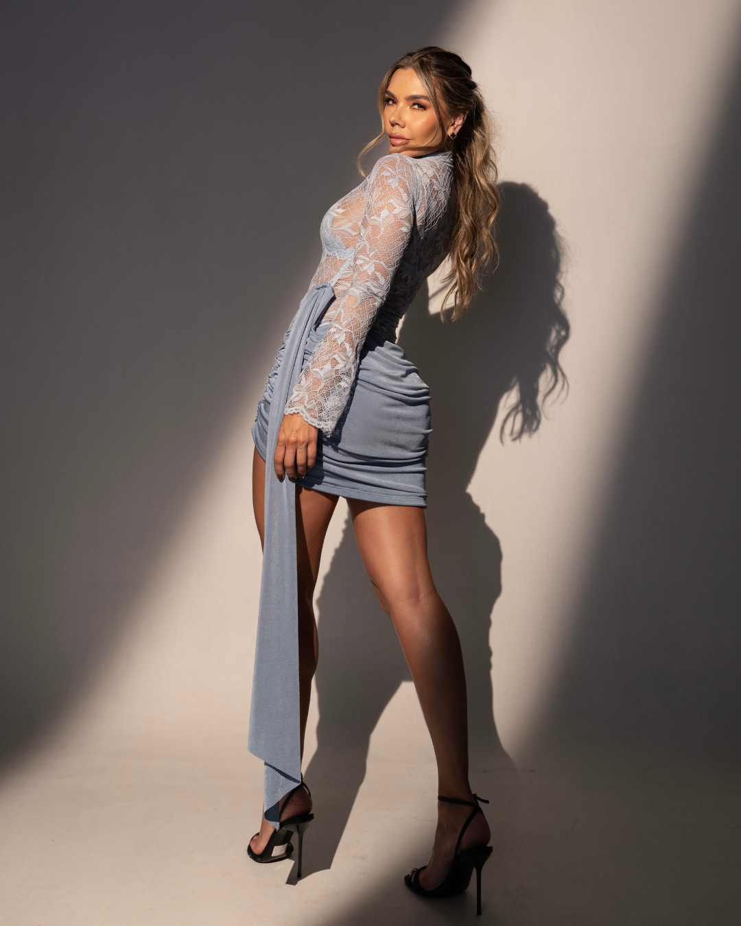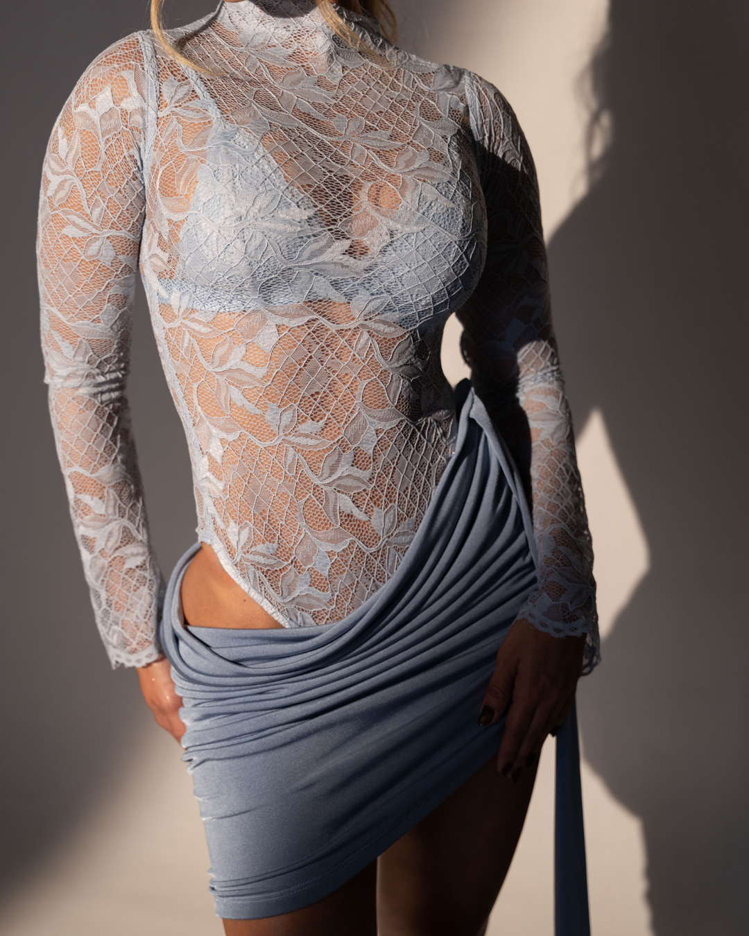 Conjunto en Blonda – Tres Piezas: body, top y falda coordinados que crean un atuendo refinado y distinguido.